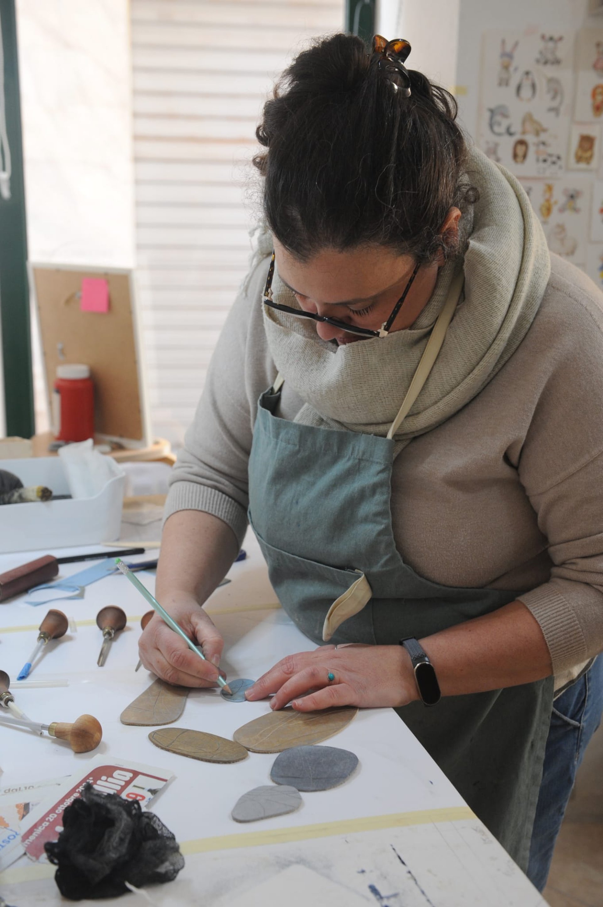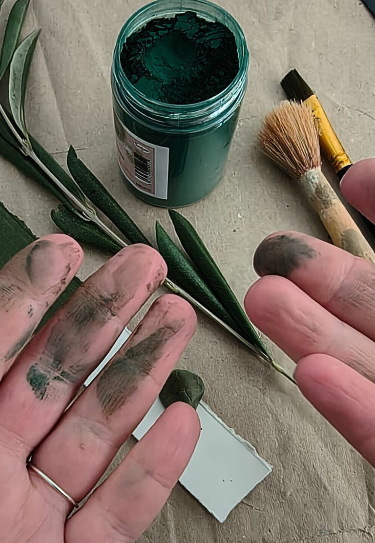 Oggi porto lo stesso sapere e gli stessi materiali nel design contemporaneo — carta cotone museale, gesso di Bologna, miscele di pigmenti e leganti formulate a mano. I colori nascono dal territorio: i grigi dell'ardesia, il verde della macchia mediterranea, il blu delle scogliere d'inverno.