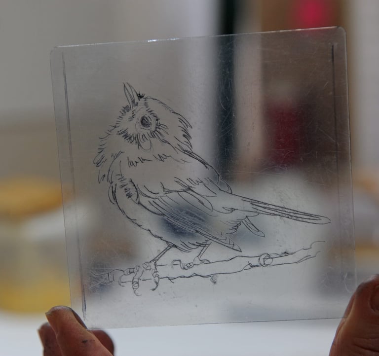 La lastra in plexiglass viene incisa a mano, segno per segno, con uno strumento a punta — la stessa tecnica usata dai maestri incisori europei dal Quattrocento. Al torchio, l'inchiostro si deposita nei solchi e si trasferisce sulla carta con la pressione giusta. Il risultato non è una riproduzione: è il pezzo originale, unico nel suo segno.